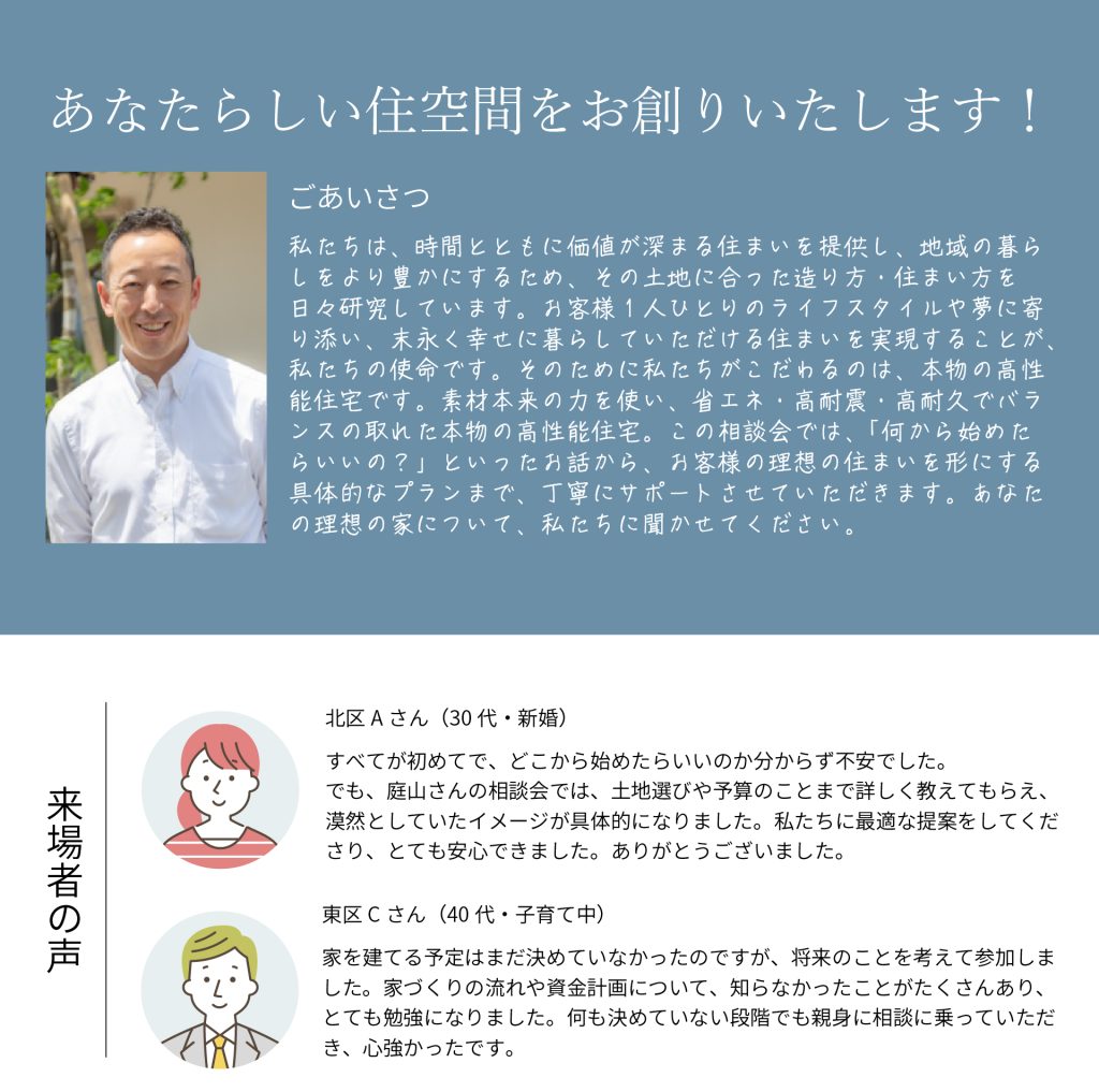 「家づくりがどんなものか」を知っていただき、少しでも不安を解消していただきたいと思っています。